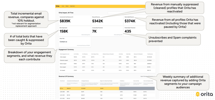 Your Orita Dashboard gives you a clear, ongoing view of how Orita impacts your email performance, list health, and revenue.
